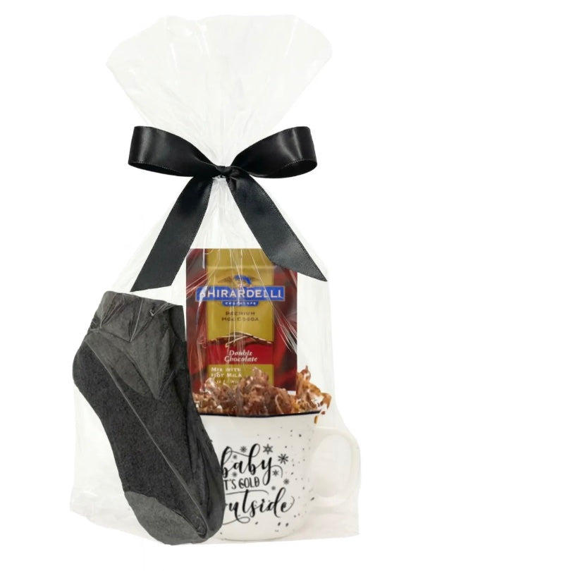 Cozy up this winter with our camper style mug, brimming with delicious Ghirardelli Cocoa and a snug pair of fuzzy socks. This gift set is elegantly wrapped in clear cellophane and tied with a beautiful bow, making it a perfect gift presentation. Choose from a variety of colors. Customize this kit to suit your budget. Build your own. Choose from a variety of filler options. Additional options: Full color card, drop shipping, kitting services, full color, heat transfer, and embroidered imprinting. Mug size: 3.6" H x 4" Dia. Sock size: 11" L x 3.5" H