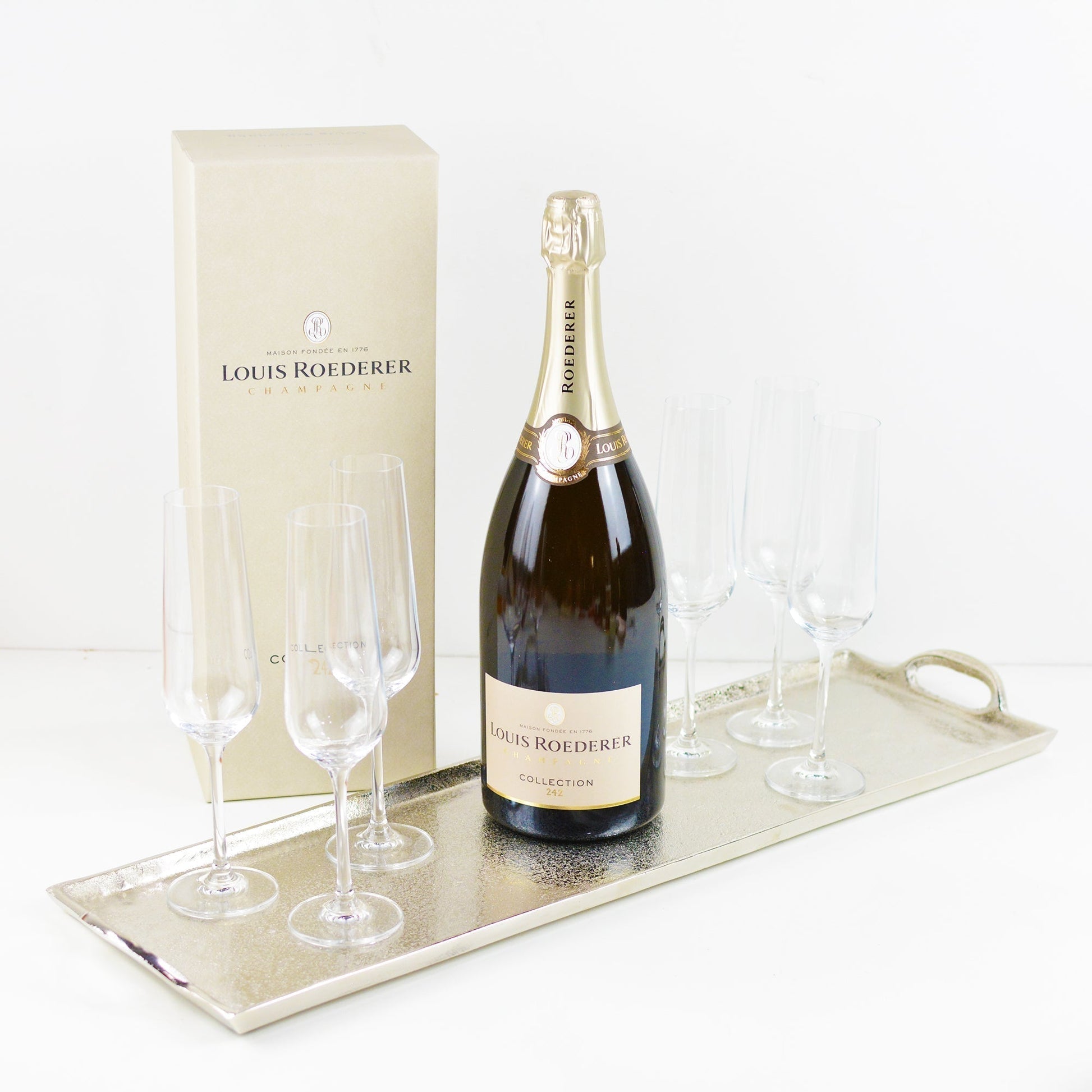 Entertain in style with this exclusive Louis Roederer Champagne 1.5L Gift Set. Perfect for special occasions or a team celebration, this opulent gift set includes 6 crystal champagne glasses and a stylish silver serving tray. Raise a glass to true luxury.